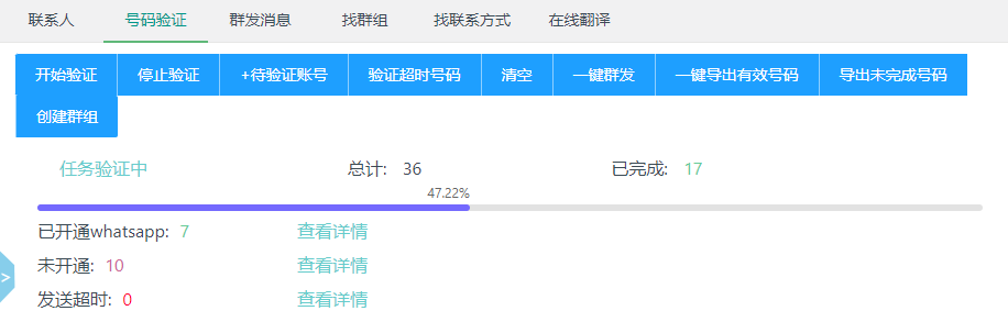 进入验证选项卡,导入手机号,同时可以批量添加国际区号。点验证按钮。